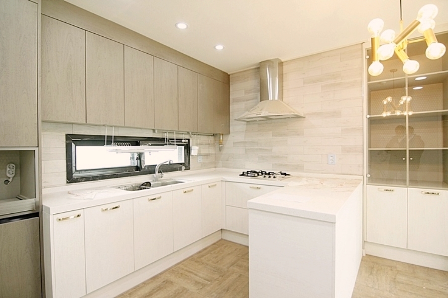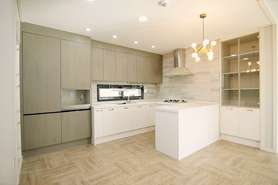 거실과 분리된 주방 공간은 U자형 주방으로 원목 식탁과 아일랜드 식탁이 결합되어 별도의 식탁을 준비할 필요가 없고 수납공간과 조리대도 넉넉하다. 붙박이주방 옆 다용도실이 넓어서 주부님들이 아주 좋아하실거에요.